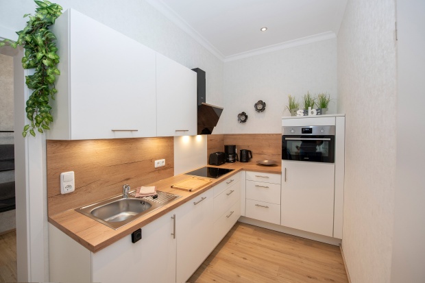 - Küche mit Spülmaschine, Back-Mikrowelle-Kombi, Kaffeemaschine, Wasserkocher und Toaster